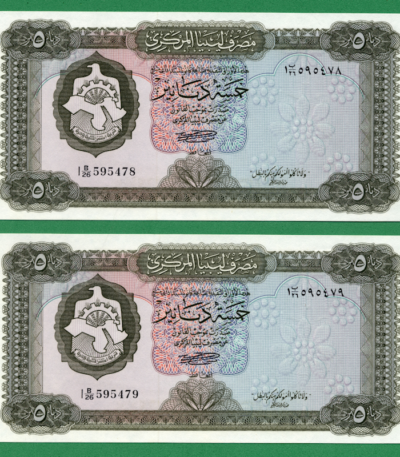 Libya 5 Dinar 1971 *2 Pcs. w/ following numbers Pick#36b (with insription) UNC – çil
