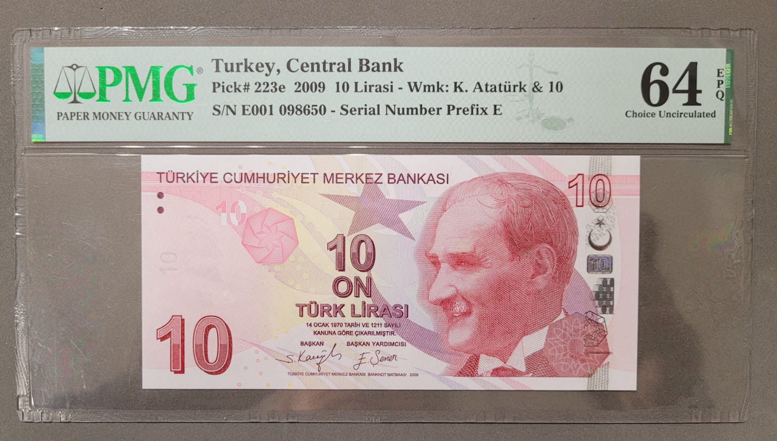 9. Emisyon 10 Lira 2009 Pick # 223e *E001 – PMG sertifikalı 64 EPQ sertifikali çil banknot
