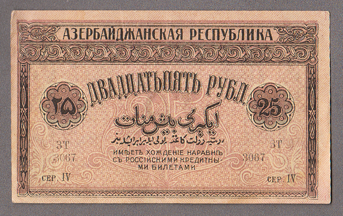 AZERBAYCAN Azerbaijan Republic (after collapse of Czarist Russia) 25 Ruble 1919 aUNC