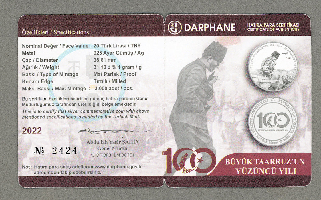 Büyük taaruzun 100. yılı Atatürk Dumlupınar gümüş sertifikalı