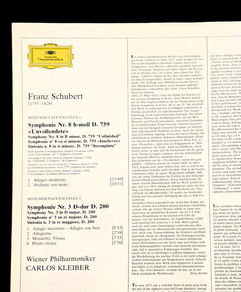 FRANZ SCHUBERT Symphonien Wiener Philharmoniker – Carlos Kleiber *Printed in Germany LP 9 / Kapak 8,5