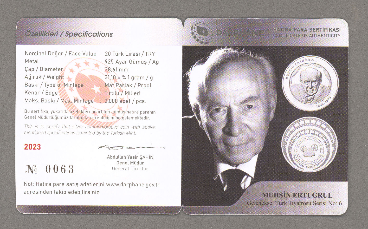 Geleneksel Türk Tiyatrosu no. 6 Muhsin Ertuğrul Gümüş Hatıra Parası sertifikalı